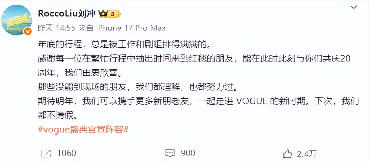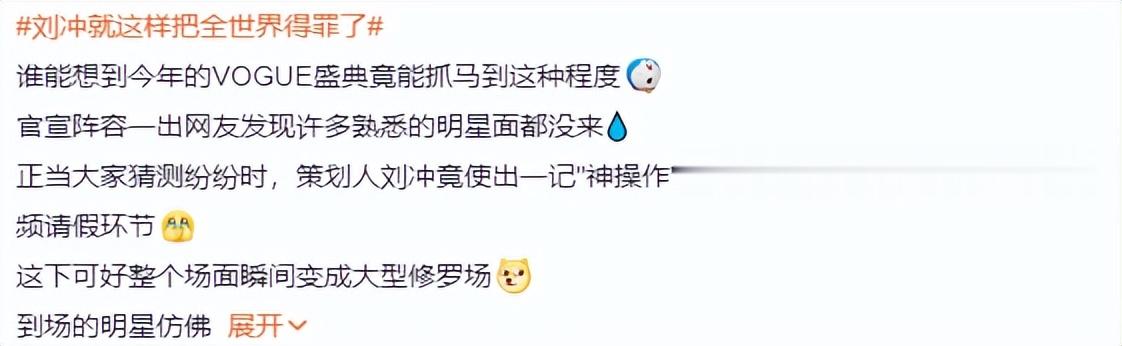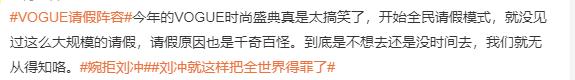 在VOGUE盛典召开的前两天,刘冲却做出了一个让人意想不到的决定,那就是让所有没来的明星,录制一个“请假视频。”